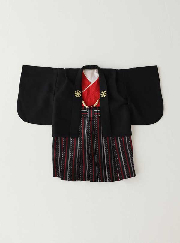 羽織袴デザインの一着です。艶やかな黒の生地の羽織はシンプルでありながらもエレガントな印象を与えます。内側の鮮やかな赤色がコントラストを生み出し、目を引くポイントになっています。前面には金色の紋があしらわれており、着物全体にエレガントなアクセントを加えています 落ち着いたトーンのシックなストライプの袴は全体のバランスを整え、子供らしさと華やかさを一層引き立てます。