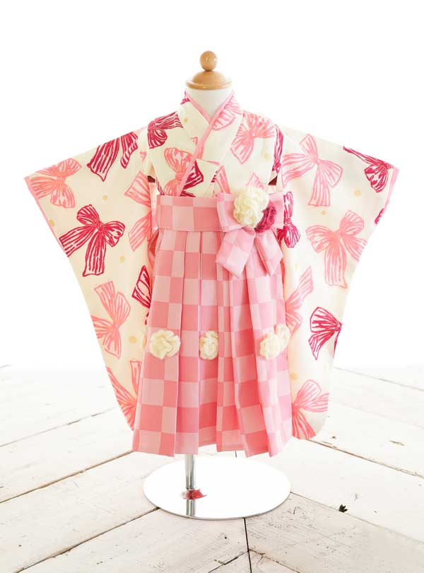 モダンなリボン模様の着物に古典的な市松柄の袴がレトロ可愛いベビー用袴。袴にはアクセントコサージュが施され、子供らしい可愛いらしいデザインです。ピンク×ホワイトの組み合わせがキュートな印象を与え、女の子らしさをアップしてくれます。 セパレートタイプで着付けやすく、小さいお子さまでも楽に着用できる着物です。