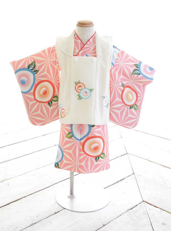 優しいピンクを基調とした麻の葉文様が特徴のベビー着物です。オレンジとブルーで描かれた椿の柄がモダンで目を引きます。 クリーム色の被布コートも人気のポイントで、ご家族やご姉妹で淡いトーンで衣装を合わせたい場合もおすすめの1着です。上下セパレートタイプになっているので小さなお子様でもお着替えしやすいです。