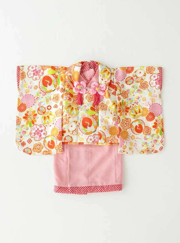 女の子に人気のピンクカラーのベビー着物です。ピンクを基調とした着物にカラフルな古典柄が全体に施された被布コートを合わせたとても可愛らしい1着。 着物自体はセパレートになっているので着付けやすく、お腹部分もゴムタイプになっているので小さなお子様でも負担なくお着替えが可能です。初節句で人気のデザインです。