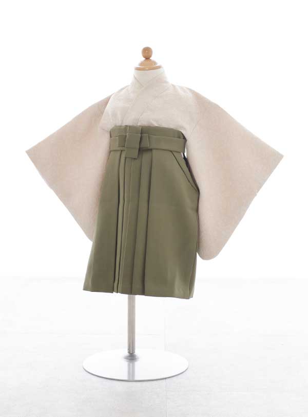淡いクリーム色と落ち着いたオリーブグリーンの組み合わせがナチュラルで可愛らしい印象を与えます。 ベージュの着物には全体的に花柄の模様が施されており、シンプルながらも細部に工夫が感じられるデザインです。 セパレートタイプで着付けやすく、小さいお子様でも楽に着用できる着物です。