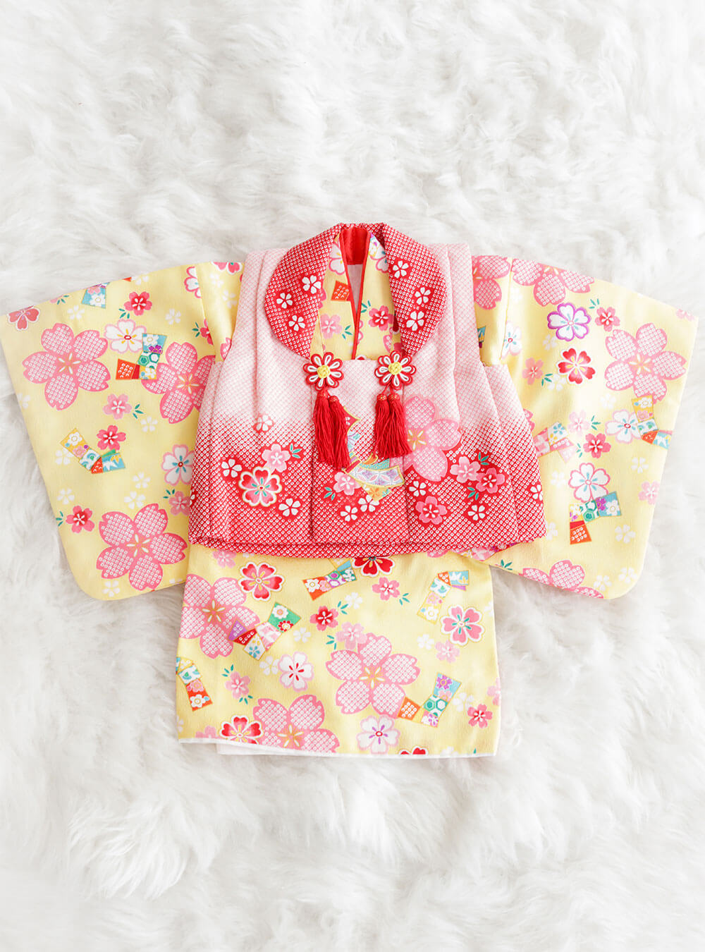 鮮やかな黄色を基調に、赤やピンクの桜模様が施された華やかなデザインが特徴です。 襟元の赤い装飾とタッセルが全体にアクセントを加え、伝統的なデザインを現代風にアレンジし、可愛らしさと品格を兼ね備えたデザインです。