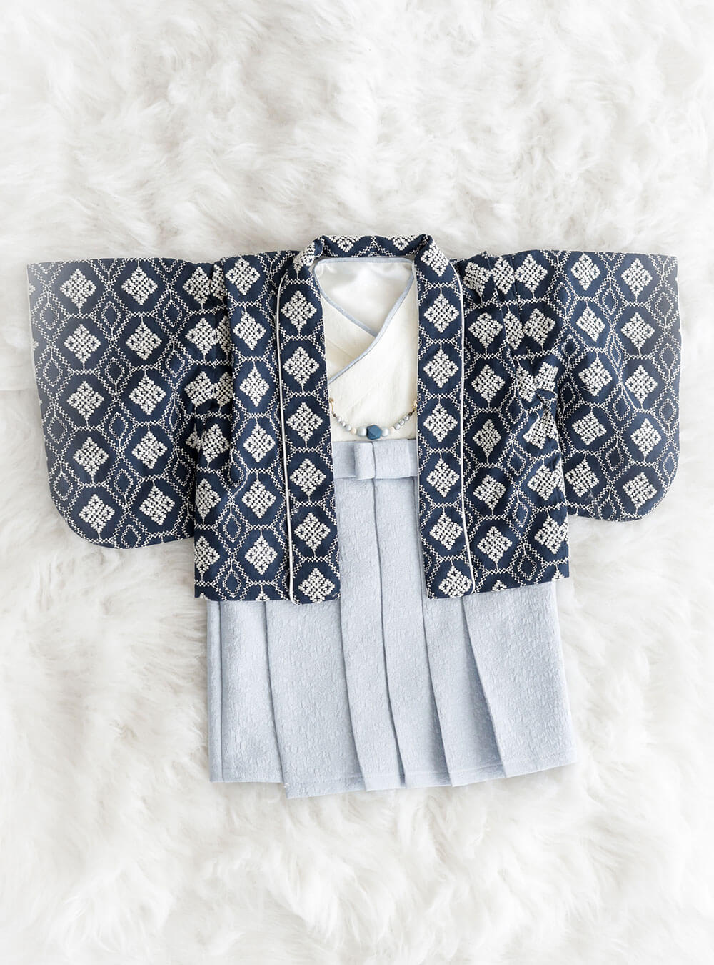 深い紺色と繊細な模様が施された羽織と袴のセットは、格式の高い和の美しさを表現しています。 赤ちゃんの特別な日をより一層引き立てる着物です。
