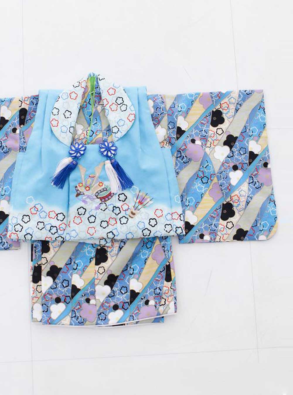 水色を基調とした可愛らしいデザインのベビー着物です。着物全体に熨斗柄が施された縁起のよいデザインです。被布コートには兜が描かれているのもポイントです。初節句の撮影におすすめです。 着物自体はセパレートになっているので着付けやすく、お腹部分もゴムタイプになっているので小さなお子様でも負担なくお着替えが可能です。