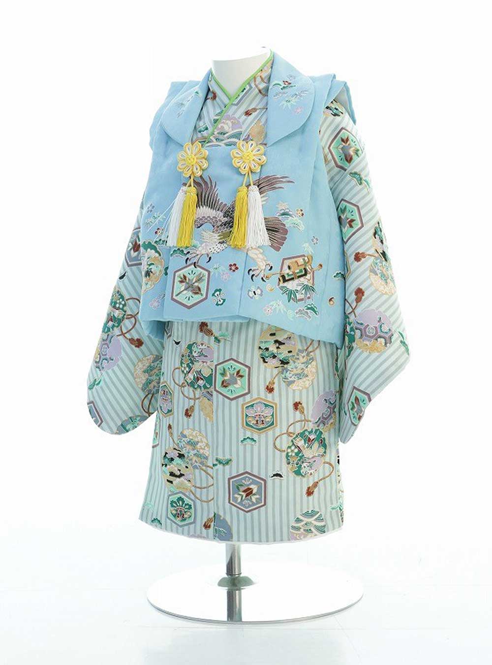 水色を基調とした爽やかな色彩が特徴のベビー用被布。伝統的な古典柄がいくつも描かれたデザインの着物でメインとなる鷹の図柄には、「先を見通す力が持てるように」「幸運をしっかりつかむように」との意味が込められています。 また出世や大成の願いも込められていることから男の子に人気の高い図柄です。