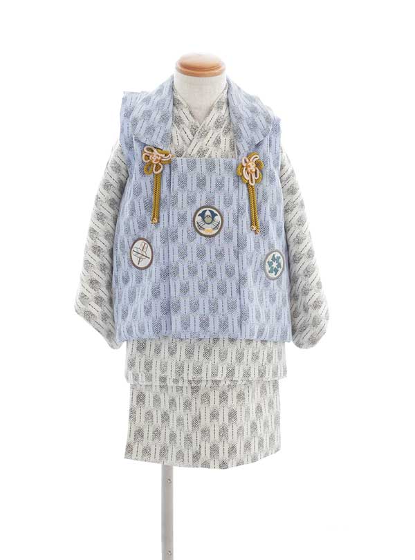可愛らしい被布タイプの和装。優しいライトグレーと淡い水色を基調とした色合いで、今どきのおしゃれな1着。着物と被布全体に矢の柄が施され、現代的なセンスと伝統が融合しています。 黄色の花のモチーフと紋があしらわれており、子供らしさを引き立て華やかさも演出する。生地感がフワッとしているため、可愛らしいシルエットを作り出します♪