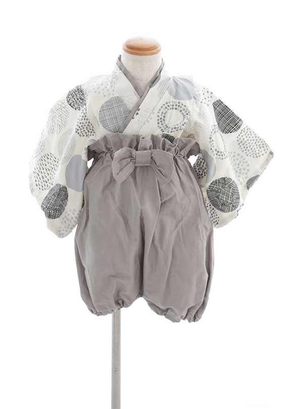 グレーの袴タイプの着物。モダンな和風デザインが目を引くおしゃれな1着です。ナチュラルなグレートーンに大胆な円模様がアクセントになっている着物。柔らかなグレーのパンツは少し締め色となり、裾の丈は少し長めなので足元にタプっと膨らむ感じが赤ちゃんっぽく可愛いデザインです♡ 白、ブルー、グレーのお色味で男の子らしさもでる1着になっております。