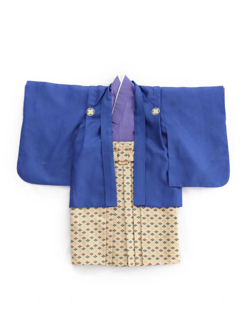 落ち着いた雰囲気の深い青色が基調となっていて、男の子らしい爽やかさを感じさせます。深い青色の着物は、光沢があり高級感があります。袴は、着物とのコントラストが美しく、袴には幾何学模様で、淡い色合いが青色の袴と調和しています。 全体的に伝統的で落ち着いた雰囲気を持ちながらも、明るく華やかな色味が可愛いらしさを引き立ててくれる1着です。