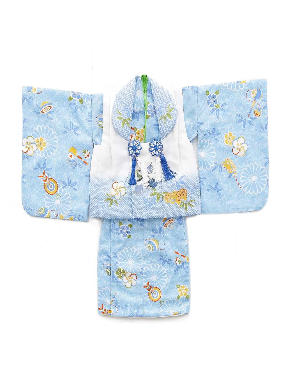 白と水色の組み合わせが赤ちゃんらしさがありとってもかわいい1着です。花やめでたい飾りが全面に施されており古典的で兄姉の衣装と合わせて古典柄で揃えるのもオススメです。 水色は男の子らしい爽やかさを感じさせます。男の子らしい柄が着物に沢山描かれ、端午の節句などにも用いられます。