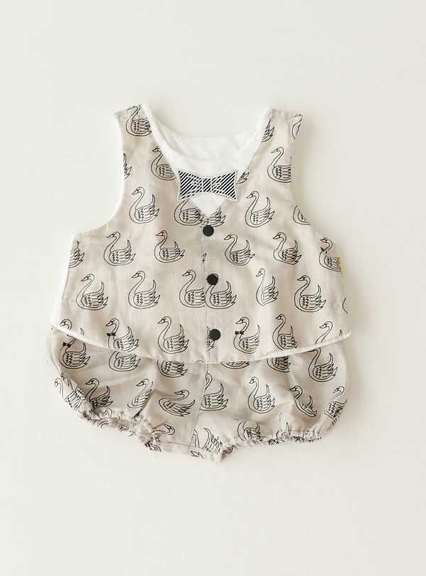 白鳥柄が特徴的なセットアップ衣装。シックな白とグレージュカラーで全面に可愛らしい白鳥柄がプリントされています。 トップスはベストスタイルでボタンが付いており、胸元には小さな蝶ネクタイもプリントされています。パンツはトップスと同じデザインのパンプキンパンツで、動きやすく可愛いデザインになっています!