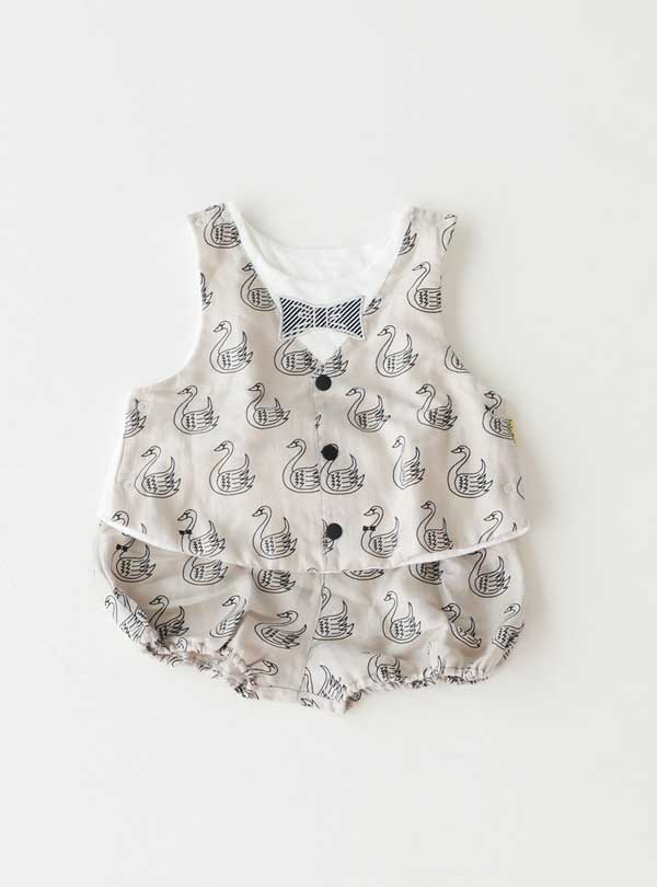 白鳥柄が特徴的なセットアップ衣装。シックな白とグレージュカラーで全面に可愛らしい白鳥柄がプリントされています。 トップスはベストスタイルでボタンが付いており、胸元には小さな蝶ネクタイもプリントされています。パンツはトップスと同じデザインのパンプキンパンツで、動きやすく可愛いデザインになっています!