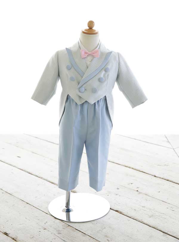 淡いブルーとグレーの燕尾服の衣装。ブルーグレーのジャケットにライトブルーの襟やボタンのデザインが付いており、ピンクの蝶ネクタイがやや可愛いイメージに仕上げています! パンツはゆったりとしたシルエット。ジャケットより濃い色のライトブルーで全体的に爽やかな印象です!全体が淡い色味なので白色の背景での撮影がオススメ!