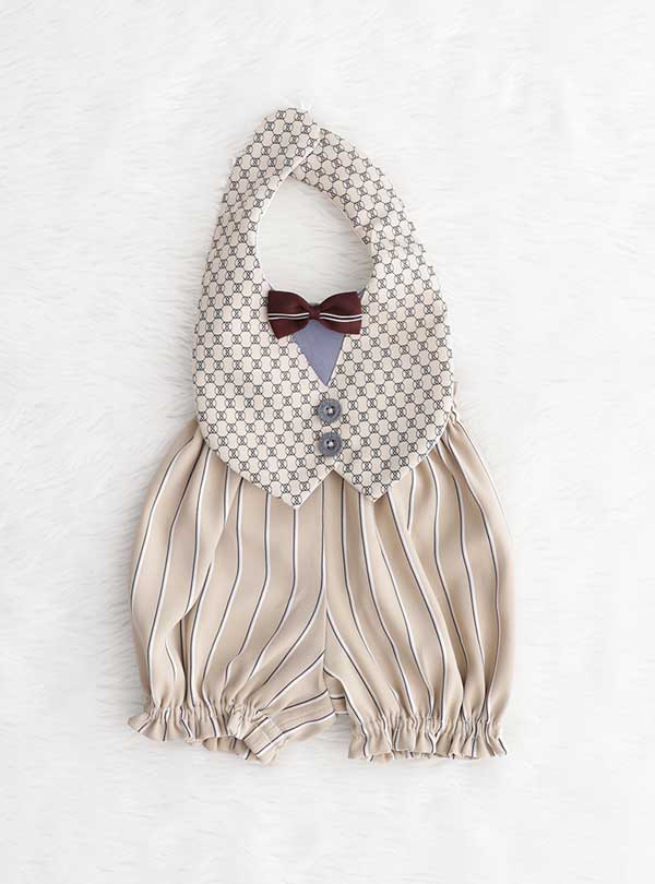シックなデザインと遊び心が溢れるディテールが魅力的です。エレガントなパターンの上半身は、小さなボタンとボウタイがアクセントを添え、フォーマルな雰囲気を演出します。 下半身のストライプはクラシックで洗練された印象を与えます。特別な日にピッタリな一着で、赤ちゃんの個性を引き立てる洗練されたベビー衣装です。