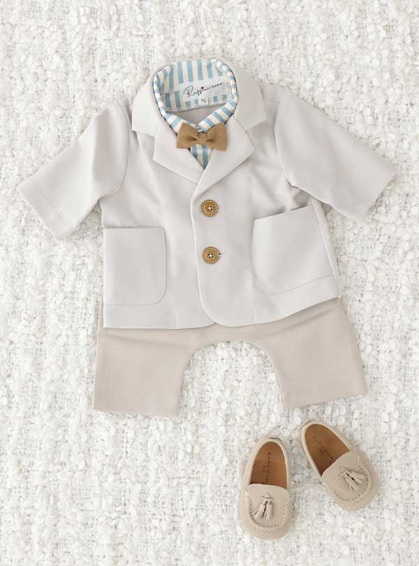 特別な日にぴったりのエレガントさと可愛さを兼ね備えたデザインの一着です。シンプルでありながらも洗練された印象を与えるジャケットからのぞくブルーのストライプのシャツがさりげないオシャレ感を演出しています。 シックな小さい蝶ネクタイが全体のコーディネートに華やかさと遊び心をプラスし、子供らしさとエレガントさを見事に両立させています。