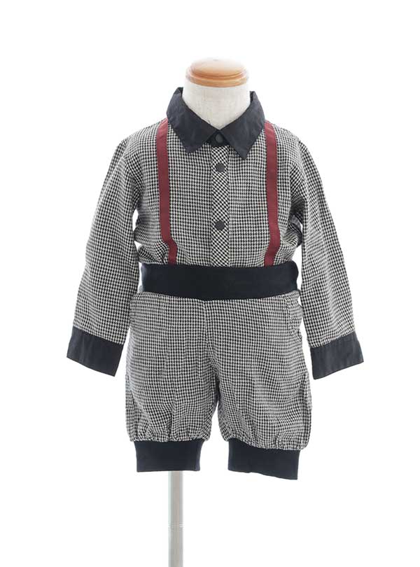 ハウンドトゥース柄のセットアップの衣装です。黒と白のデザインがシックな雰囲気でかっこいい良い雰囲気にしたい方にはオススメです。えんじ色のラインがポイントになっておりとてもスタイリッシュな印象です。 ハーフパンツになっているのでベビー時期ならではのぷくっとした足も可愛く写真に残すことができます。ご家族撮影をされる際はパパやママもモノトーンコーデでシックにまとめるのがおすすめ。