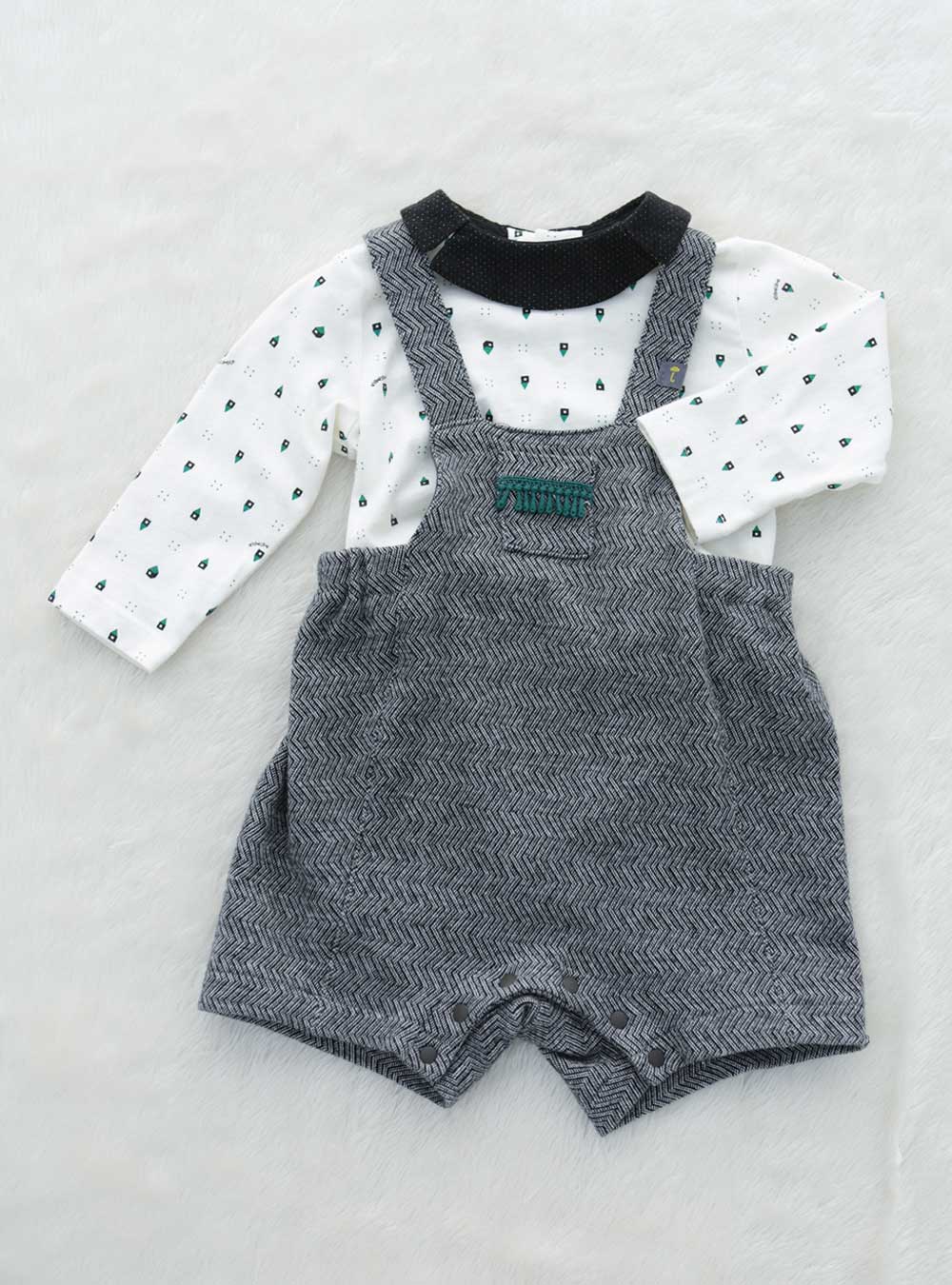ドットシャツにグレーのサロペットを合わせたカジュアルで可愛いスタイル。襟の形が特徴的で子供らしい印象を与えます。ドットはよく見ると小さなお家!遊び心のあるデザインの衣装です。 サロペットの生地には幾何学模様が施されており細部までこだわっています。カジュアルな雰囲気で写真を残したい方におすすめの1着です。