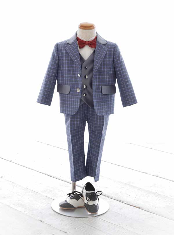 洗練されたチェック柄のタキシードです。ネイビーを基調とした美しいチェック柄が特徴で、スタイリッシュなデザインとなっています。胸元には鮮やかなレッドの蝶ネクタイがアクセントとなり全体のバランスを整え、グレーのベストが華やかさをプラスします。 パンツはシンプルなストレートのシルエットでスタイルを引き締めつつ動きやすいのも魅力です。