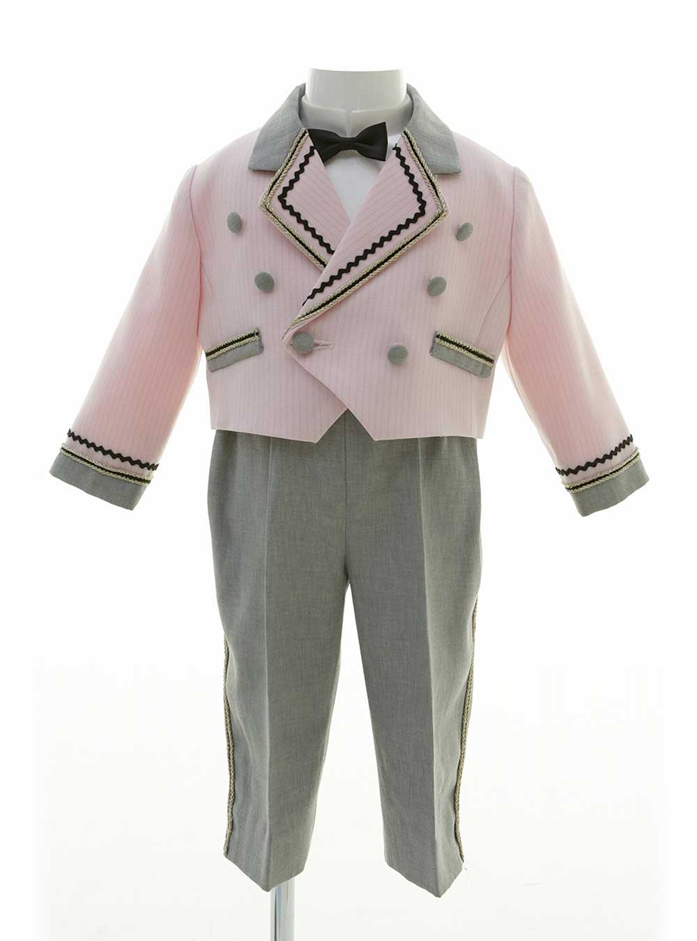淡いピンクのジャケットに、モノトーンのアクセントが映え、品のあるシルエットが際立ちます。ジャケットはダブルボタンでエレガントさを演出し、襟元の黒い蝶ネクタイが全体を引き締めています。 グレーのパンツは、シンプルでありながらも洗練された印象を与え、落ち着いた雰囲気を醸し出しています。この衣装は、特別な日の主役になること間違いなしの一着です。