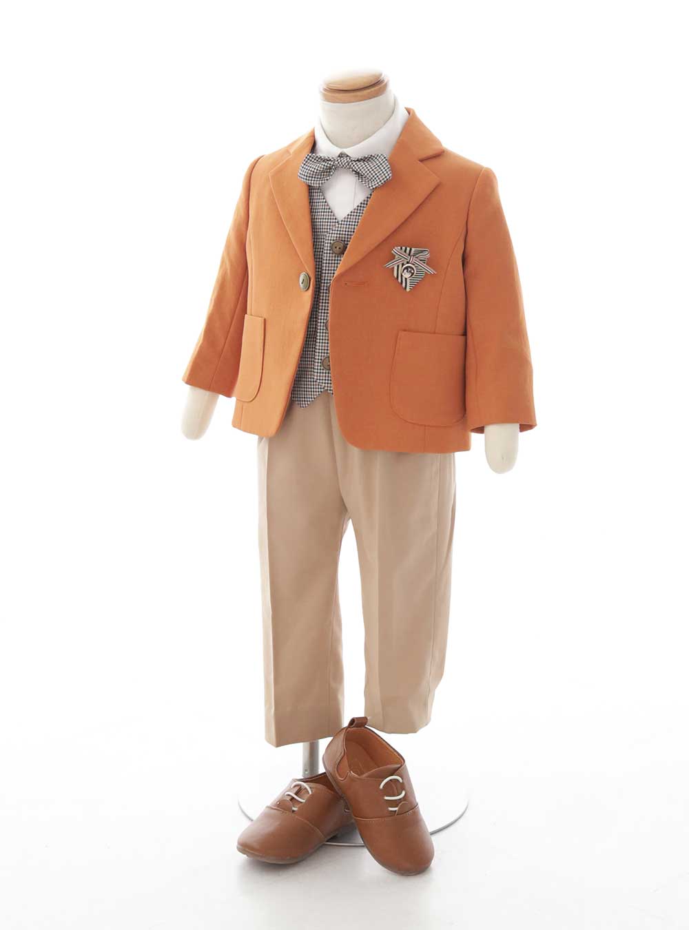 ガンクラブのチェック柄のベストがポイントのオレンジが映えるカラージャケットの衣装です。ジャケットから見えるベストがベビー衣装ながらも大人顔負けのデザインでおすすめポイントの一つです。 胸元のブローチが男の子らしい印象を与えます。ご兄姉でブラウン系の色味やチェック柄の衣装と合わせていただくと統一感がありおすすめです。