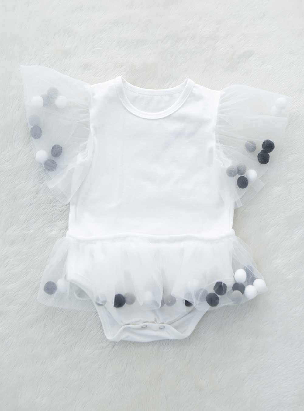 真っ白なロンパースに柔らかいチュールの素材の袖とスカートがキュートさを演出させる1着!チュールの中には、白黒グレーの丸いポンポンが散りばめられており遊び心あふれるデザインが他にはないおしゃれなベビー衣装です♪ 家族みんなモノトーンカラーで統一したり、アクセントカラーになる小物でよりデザイン性を高めたり、たくさんのパターンで楽しめる1着です。お子様の可愛らしさを引き立てること間違いなし♪