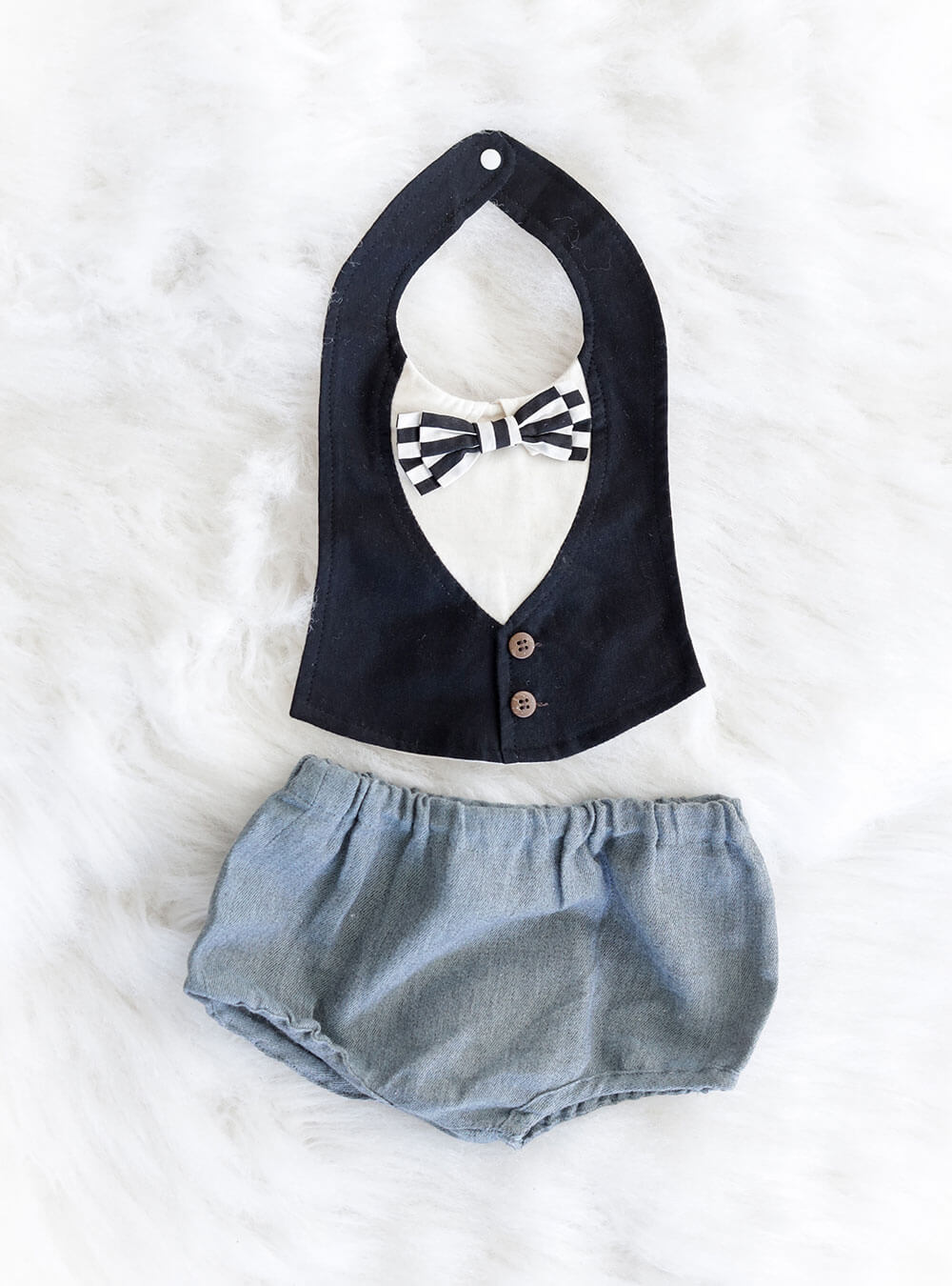 特別な日にピッタリのスタイとショートパンツのセットです。 チェック柄の蝶ネクタイと黒いベストがフォーマル感を演出しつつも、デニム風のショートパンツでカジュアルダウンもできます。