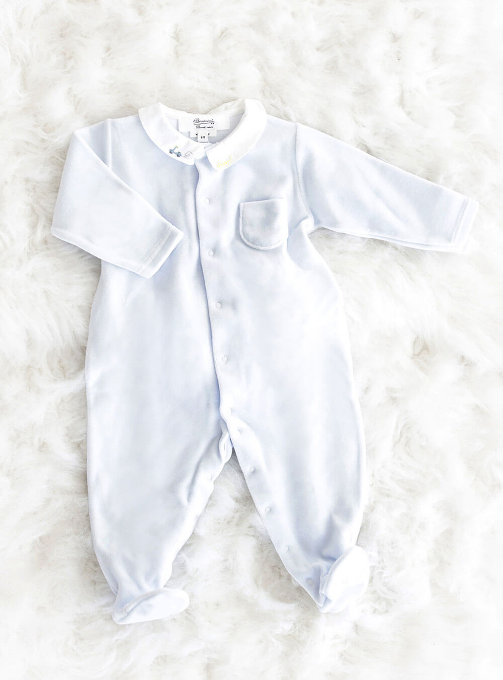 シンプルでありながら洗練されたデザインのロンパースは、柔らかく軽く素材はデリケートな赤ちゃんの肌にピッタリです。 襟元の小さな刺繍がアクセントになっており、特別な一着として活躍します。