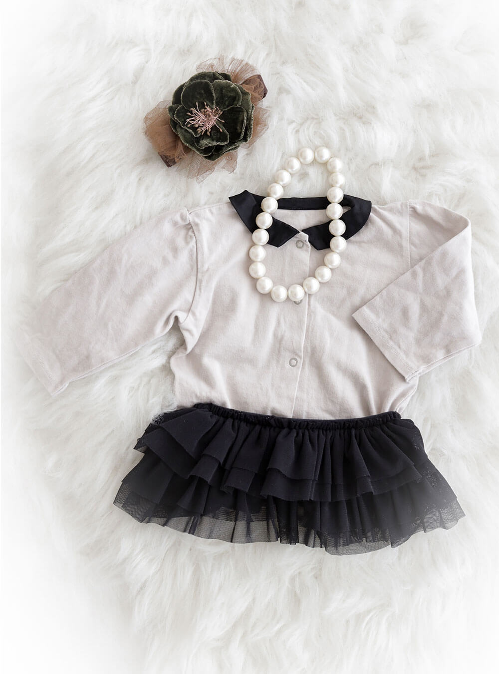 ブラックのフリルスカートとコントラストを効かせた襟付きのトップスがポイントで、シンプルながら上品でクラシックな雰囲気を演出します。スカートのフリルが複数重なり、ふわふわとした立体感が赤ちゃんの可愛らしさを引き立てます。ヘッドアクセや帽子はデザイン豊富にご用意しておりますのでお子様の雰囲気に合わせてコーディネートさせていただきます。