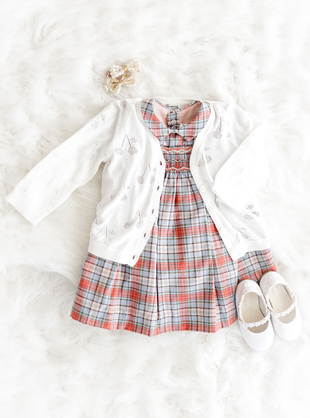 チェック柄ワンピースに、爽やかなホワイトのカーディガンを合わせたセットです。 カーディガンにはキュートなチェリーの刺繍が施されており、さりげないオシャレが光ります。