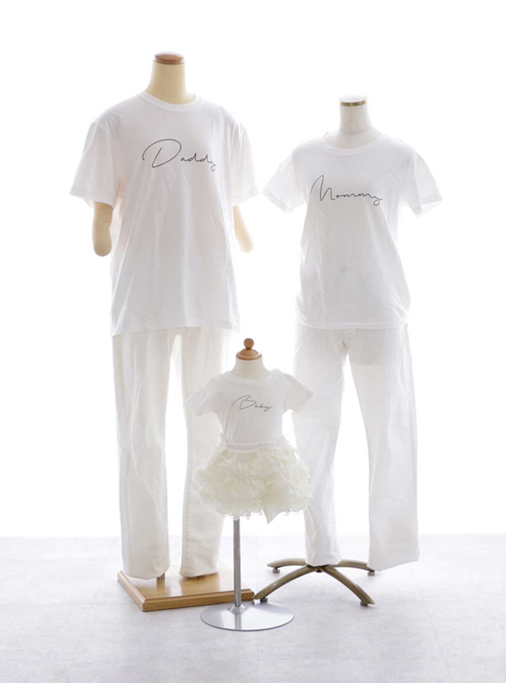 家族でお揃いで着ていただけるTシャツコーデとなっています。白を貴重とした清潔感あるデザインで、繊細なフォントで描かれた文字がアクセントとなり、シンプルながらも特別感のある仕上がりです。下は店の白デニムを合わせていただくか、お持ち込みの衣装を着用していただいても大丈夫です。心温まる家族写真をこのコーディネートでさらに彩りましょう!