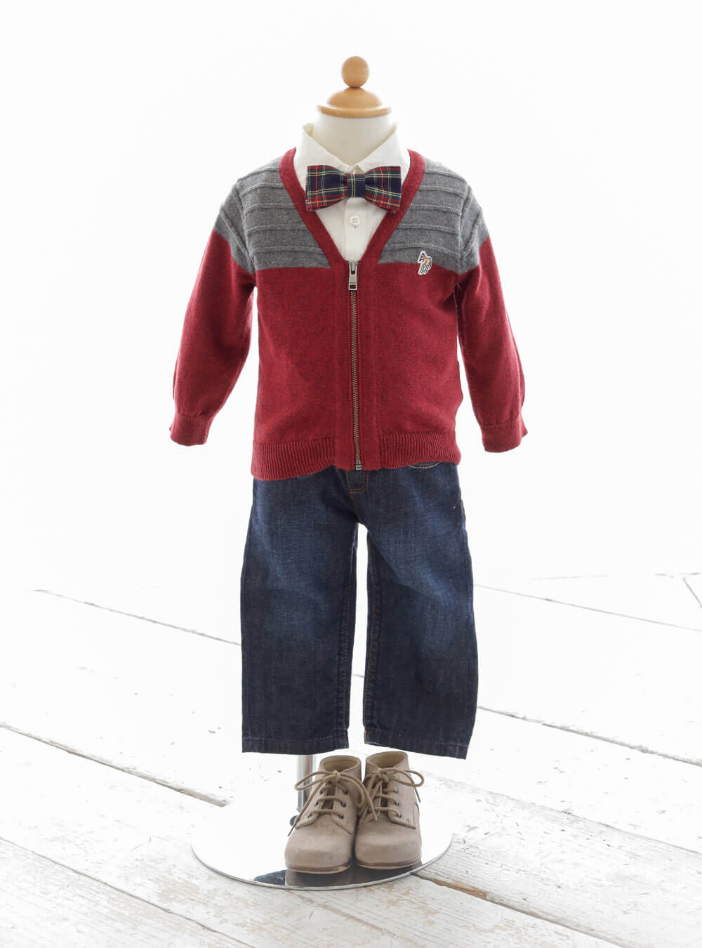 グレーと赤のカーディガンに、チェック柄のボウタイを合わせたスタイルは、少し遊び心を取り入れながらも上品な印象です。 濃いデニムパンツとベージュのシューズが、全体をカジュアルにまとめていますが、シャツとボウタイがきちんと感をプラスしています。