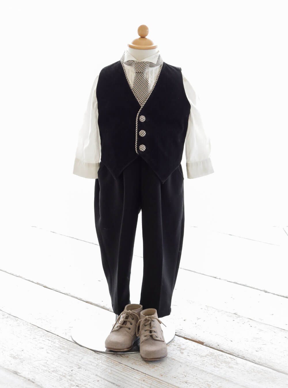 クラシカルで洗練された雰囲気を漂わせるこの子供用スーツは、黒と白を基調にしたモノトーンコーディネートが特徴です。ブラックのベストには、シルバーのボタンとトリムがあしらわれ、シンプルながらも上品さが際立ちます。ホワイトシャツとチェック柄のネクタイが、全体に洗練されたアクセントを加え、知的な印象を与えます。 パンツはスリムなシルエットで、スタイリッシュなシューズが全体のバランスを整えます。フォーマルな場面でも、控えめながら確かな存在感を発揮するこのスーツは、特別な日にピッタリの一着です。