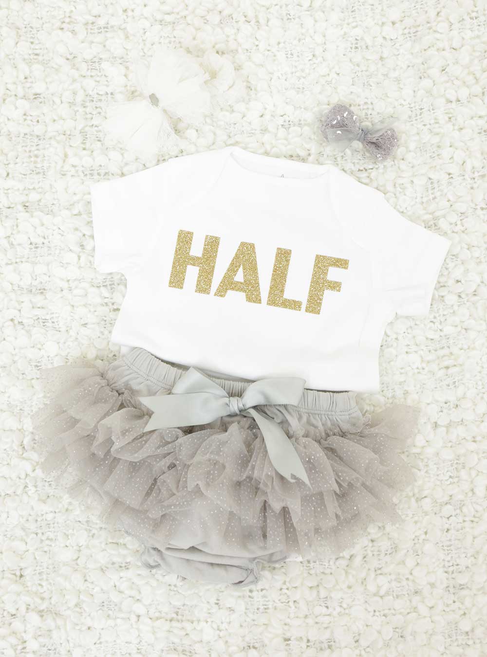 シンプルな「HALF」のロゴが入ったTシャツにグレーのチュチュパンツを合わせたハーフバースデーフォトで人気のセットです。ゴールドのロゴとシックな雰囲気のチュチュパンツなのでスタイリッシュな印象に。パパママもシックな雰囲気で合わせればクールな家族撮影が可能です。 Tシャツのラインナップはone~fiveまであるのでご兄弟で年齢ごとのTシャツを着て揃えても可愛いのでおすすめ。