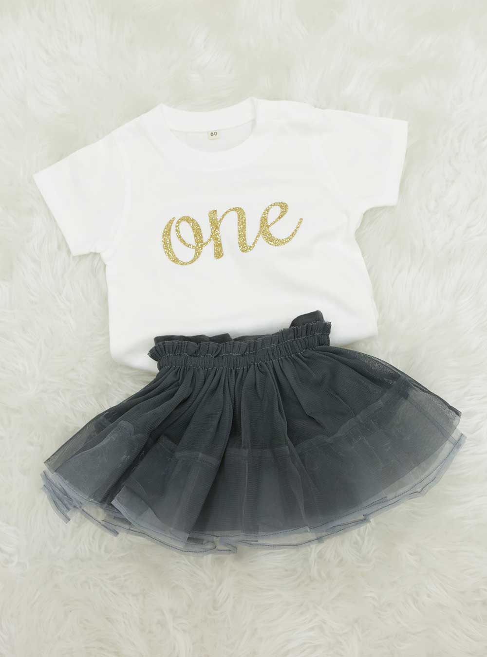 シンプルな「one」のロゴが入ったTシャツにグレーのチュチュを合わせたバースデーフォトで人気のセットです。ゴールドのロゴとシックな雰囲気のチュチュなのでスタイリッシュな印象に♪ パパママもシックな雰囲気で合わせればクールな家族撮影が可能です。またTシャツのラインナップはone~fiveまであるのでご兄弟で年齢ごとのTシャツを着て揃えても可愛いのでおすすめ。
