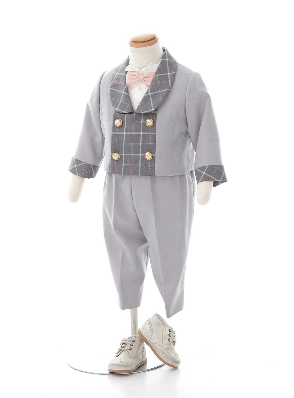 グレーを基調としたタキシードで全体的に淡くふんわりした印象です。淡いピンクの蝶ネクタイとゴールドの4つのボタンが特徴的で目を引きます。サルエルパンツがとても可愛らしいデザインで人気のポイントです。 全体的に可愛い印象の衣装なのでバルーンスタジオやホワイト系のスタジオと相性抜群。淡いトーンがお好きな方におすすめの1着です。