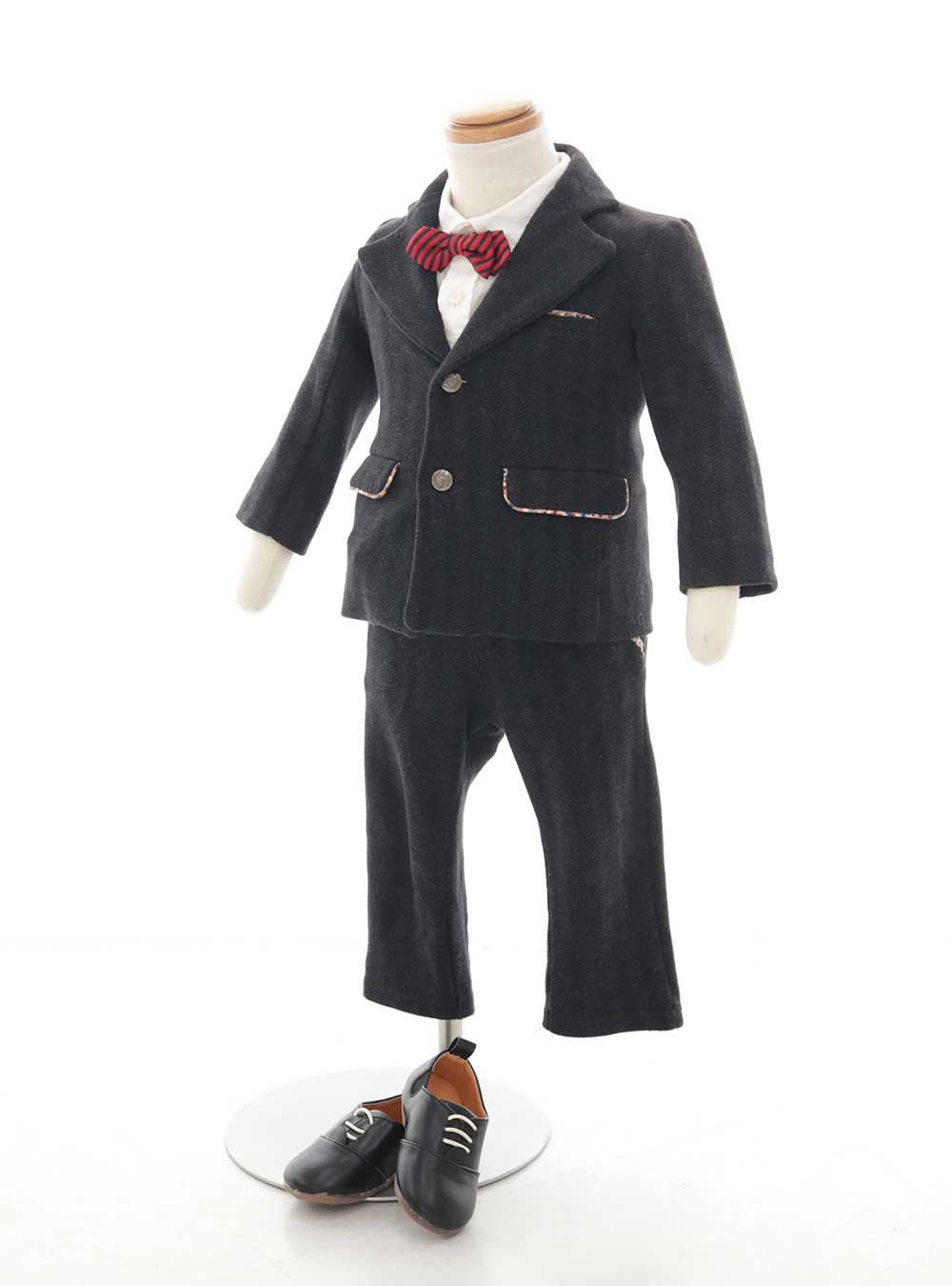 ヘリンボーン織りの生地で作られたシンプルな1着です。光沢のあるタイプとは違いヘリンボーン織りは温かみのある素材でとても人気です。ポケット部分のカラフルなパイピングがポイントになっています。赤、黒のストライプ柄の蝶ネクタイをつけることでかっこよい印象です。 全体的にシックな雰囲気なのでご家族もモノトーンコーデで揃えていただくとかっこいい家族ショットが撮影できるのでおすすめです。