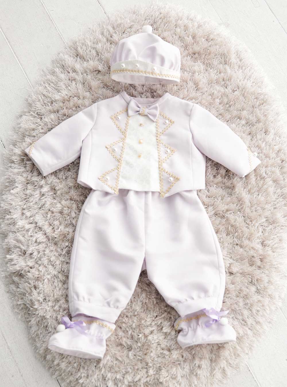 パンツスタイルで王子様のようなベビースーツ。男の子に人気の衣装です。パステル調のパープルにゴールドとホワイトの配色がお洒落で特別感のあるデザインです。セットの帽子と、足元には可愛らしいベビーシューズが付いた豪華なセットです。 蝶ネクタイの装飾も晴れの日の装いに相応しいフォーマル感を演出しています。