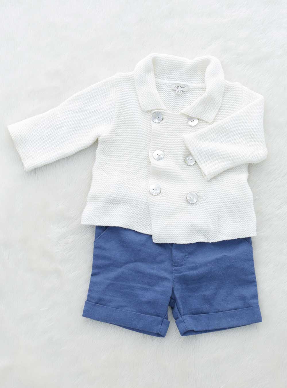 レフ版効果で顔色を明るく綺麗に見せてくれる真っ白なニットジャケット。シェルボタンがキラキラ輝き、マリンテイストのジャケットです。合わせるボトムスはブルーのショートパンツ。爽やかなカラーの組み合わせが特徴のベビー衣装です。 帽子などの小物で更にアレンジしてコーディネートを楽しむことができるので多彩なバリエーションで撮影をお楽しみください。