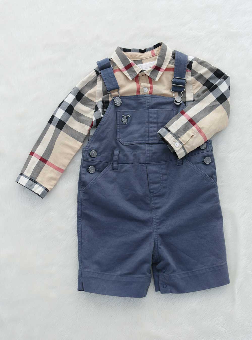 Burberryの代表的なチェック柄が可愛いシャツに、上品なネイビーカラーのオーバーオールがクラシカルで清楚な印象を与えてくれるブランド衣装。カジュアルな撮影にもフォーマルなきちんとした撮影にもお召いただけるベビー衣装です。 合わせる小物アイテムも充実のスタジオエミュならバリエーション豊かな撮影が可能です。