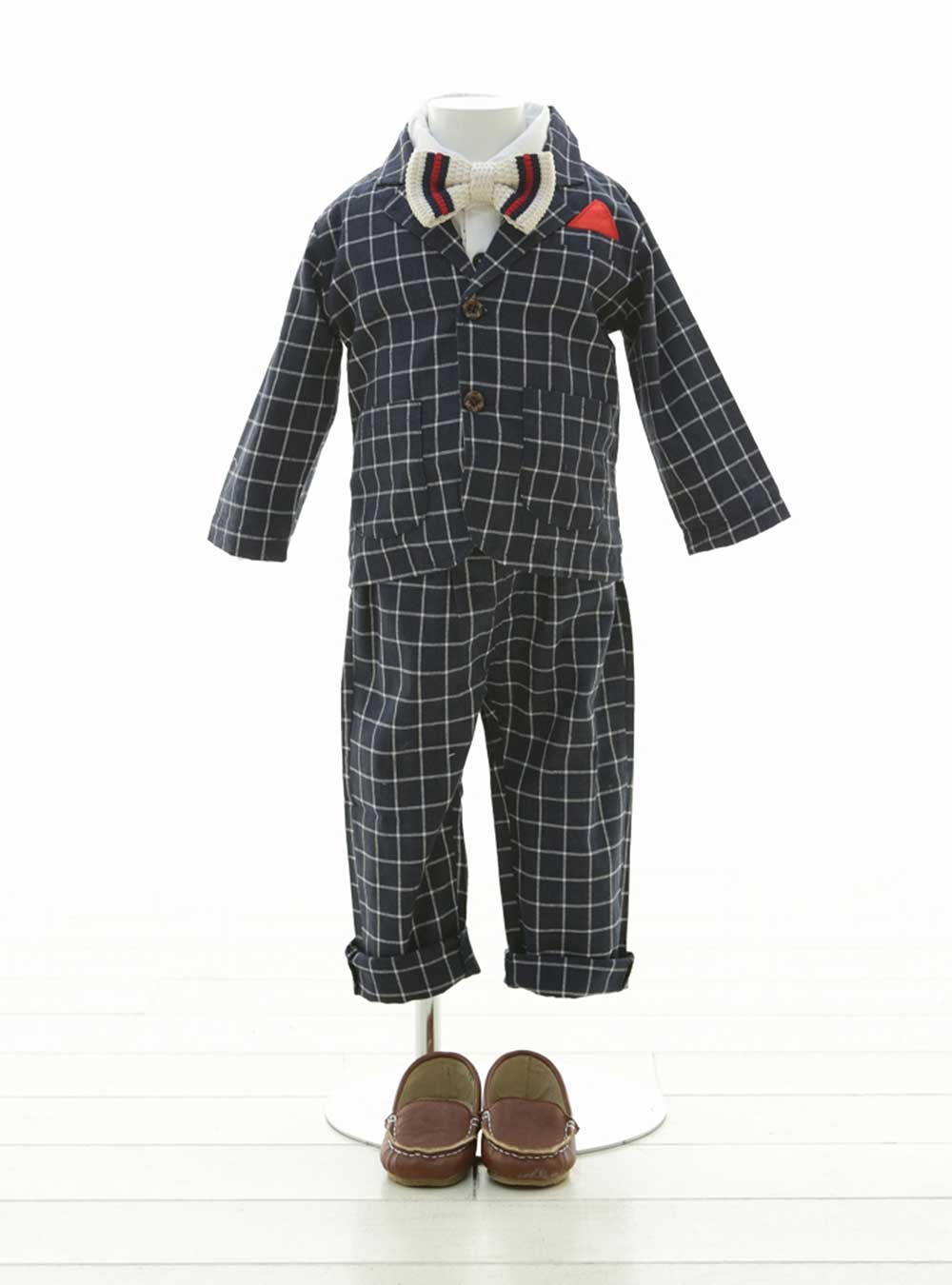 チェック柄のセットアップタキシード。ネイビーカラーのセットアップは、上品で落ち着いた雰囲気を演出します。胸元から覗く赤いポケットチーフと蝶ネクタイの赤いストライプラインがお洒落なデザイン。 蝶ネクタイの素材感もコーディネートのアクセントになっています。