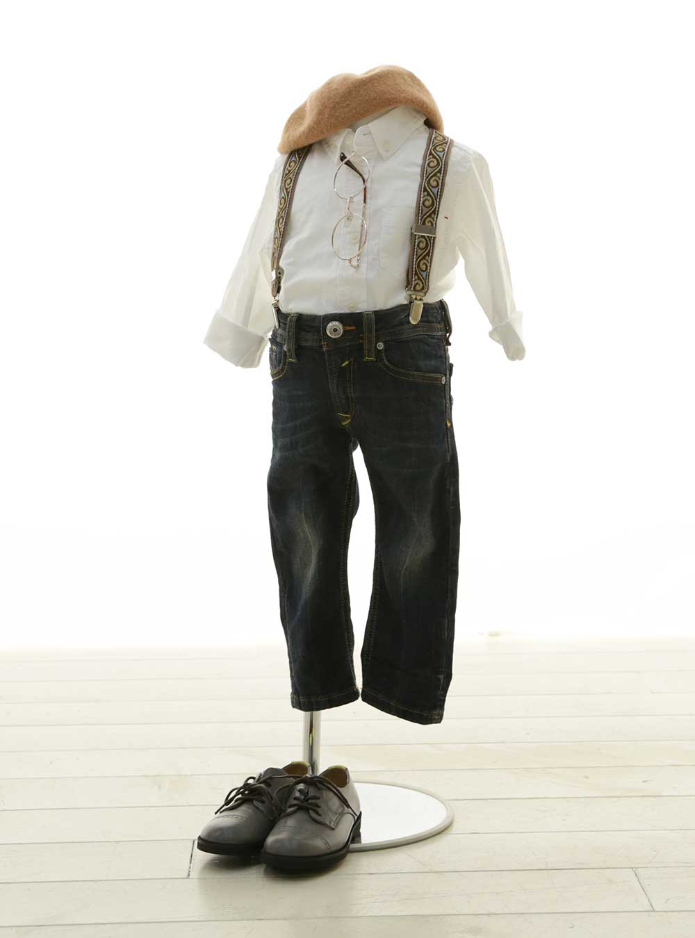 カジュアルでスタイリッシュなデザインの白シャツ×デニムコーディネート。サスペンダーがレトロなデザインで全体の雰囲気にクラシックな印象を与えてくれます。 サスペンダーを外して、トップスをアウトするとナチュラルな雰囲気で撮影する事もできるので、家族みんなの衣装に合わせてスタイリングできます。