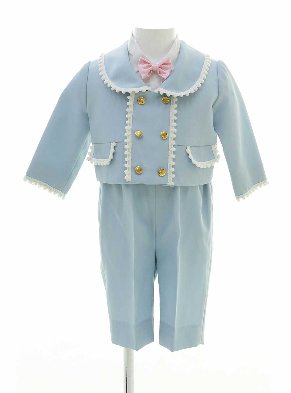 パステルブルーを基調とした上品で可愛らしいタキシード。ジャケットにはゴールドのボタンと白いレーストリムが施されており、エレガントな雰囲気を演出してくれます。 シャツはスタイタイプで楽に着用できるので小さなお子様のお着替えがスムーズにできるのも嬉しいポイントです。