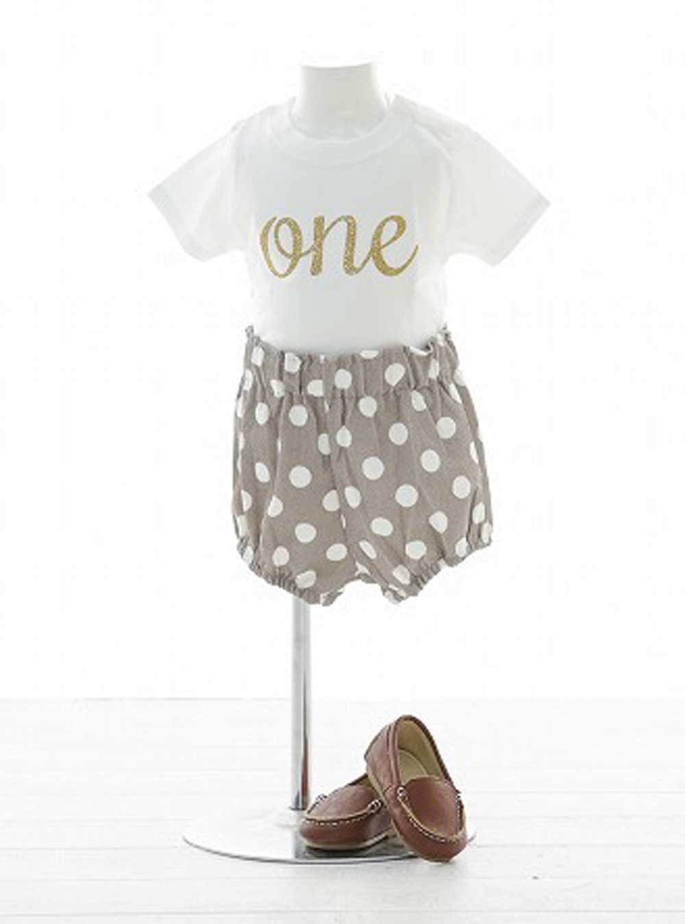 1歳のお誕生日を迎えるお子様にぴったりのシンプル可愛いデザインが特徴。白いトップスには「one」とゴールドラメがプリントされており、1歳の特別なお誕生日記念撮影にぜひ着用していただきたい衣装です。 パンツは大きな白のドット模様で、ふんわりとしたシルエットが特徴です。