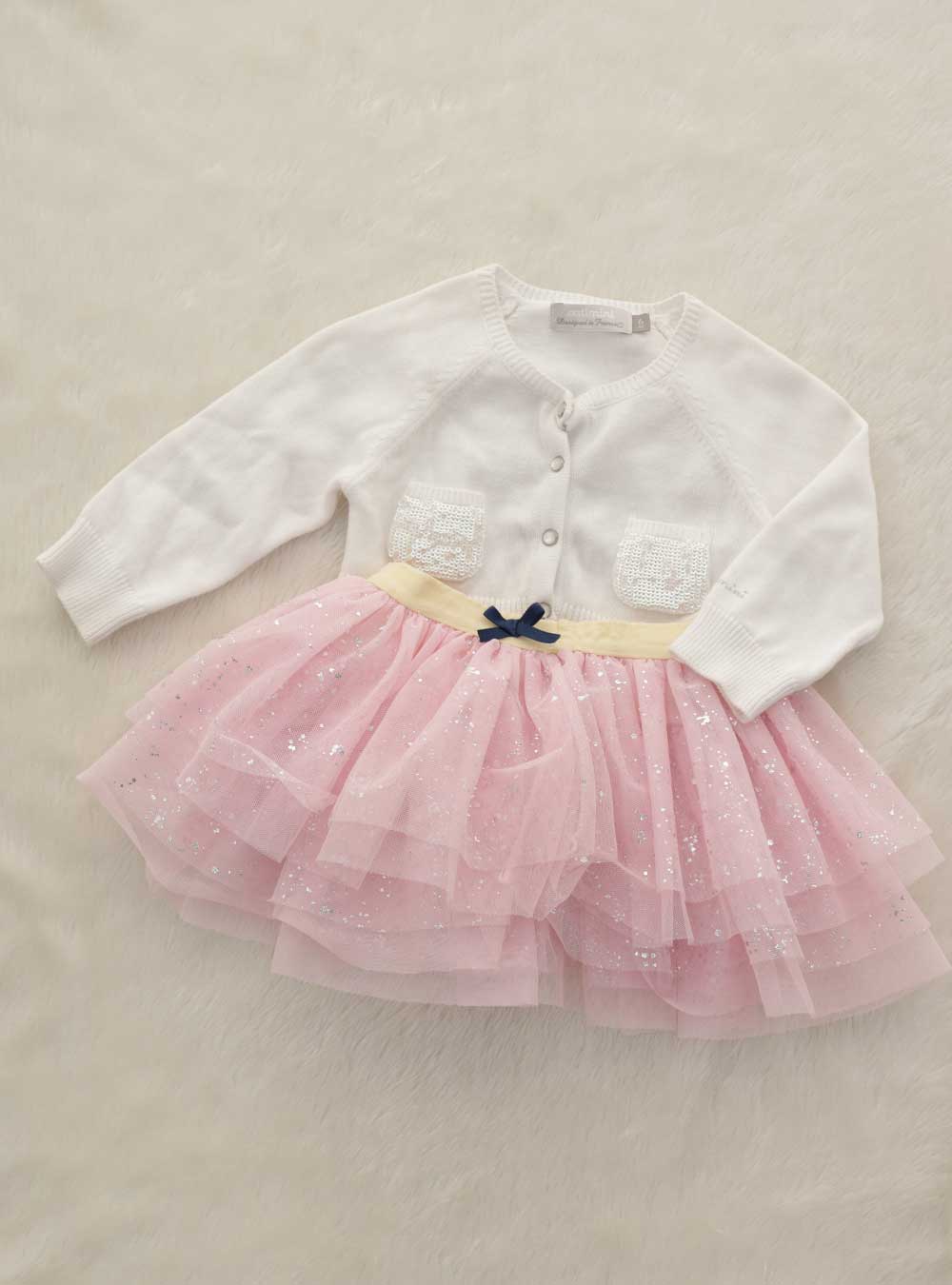 パステルカラーのチュールスカートが女の子らしいキュートなデザイン。トップスのカーディガンは一見シンプルに見えますがポケット部分にスパンコールが装飾された特別感のあるデザイン。 チュールスカートは何層にも重ねられたボリューミーチュールが華やかさを演出しています。チュールスカートは色違いの水色もご用意しています。