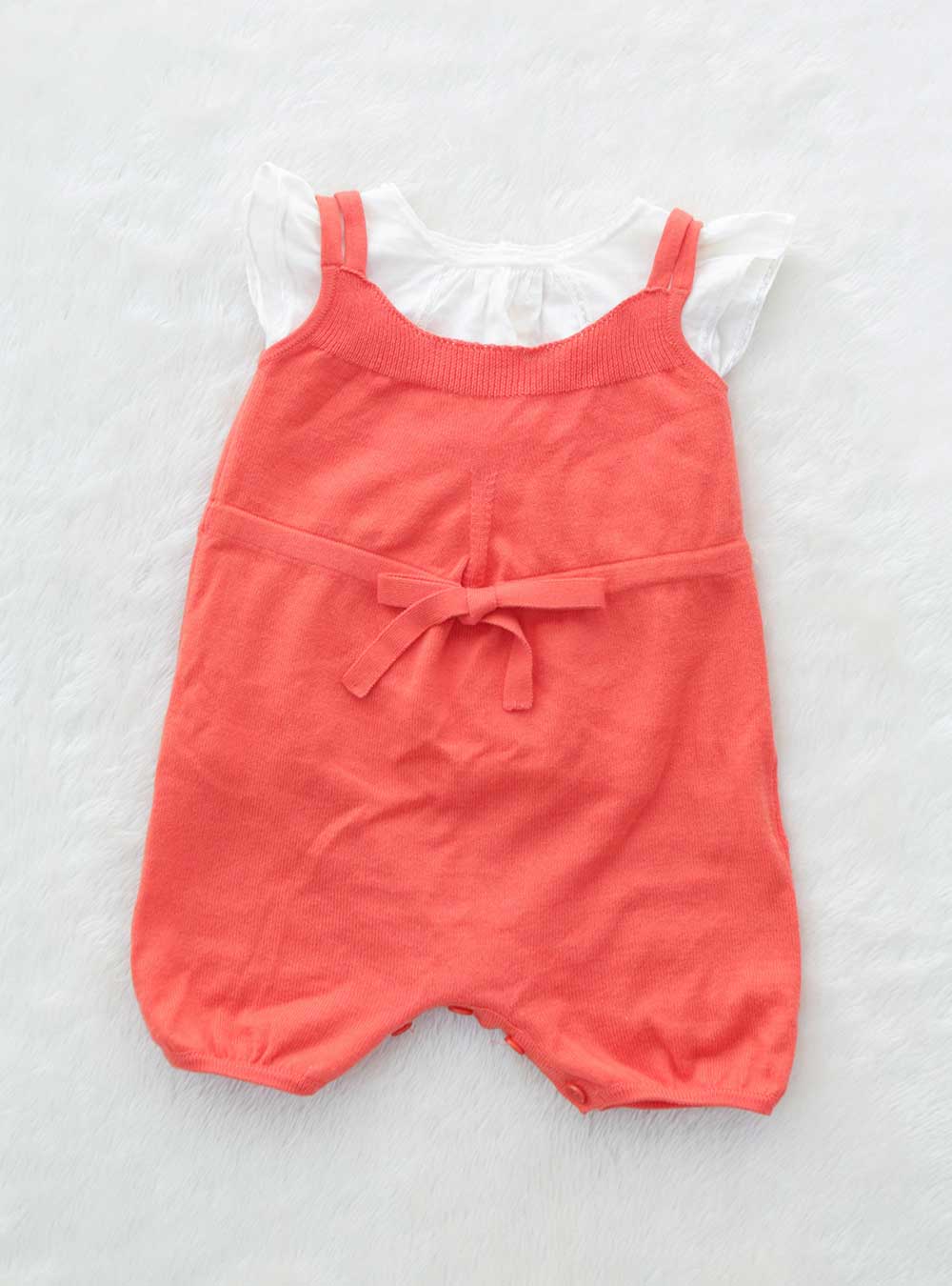 鮮やかで明るいオレンジカラーが目を引くロンパース。ゆるい大きめのフォルムとウエストのリボンがポイントの可愛らしいデザインです。 カジュアルな普段使いもできるデザインで、お子様の遊んでる姿やパパママとの日常的なスキンシップを自然体で撮影する際にお召しいただける衣装です。
