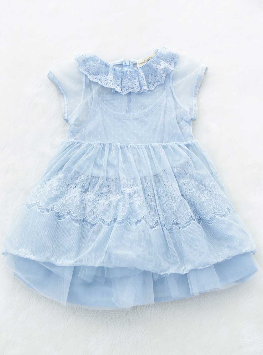 清楚でエレガントな印象を与えるライトブルーのワンピース。軽やかなオーガンジー素材を使用しており動くたびにふわっと広がるスカートが特徴です。ドレスの襟元にはフリルが付いており、愛らしさをより一層引き立ててくれます。 袖はキャップスリーブで可愛らしさとスタイリッシュな印象を与えてくれます。