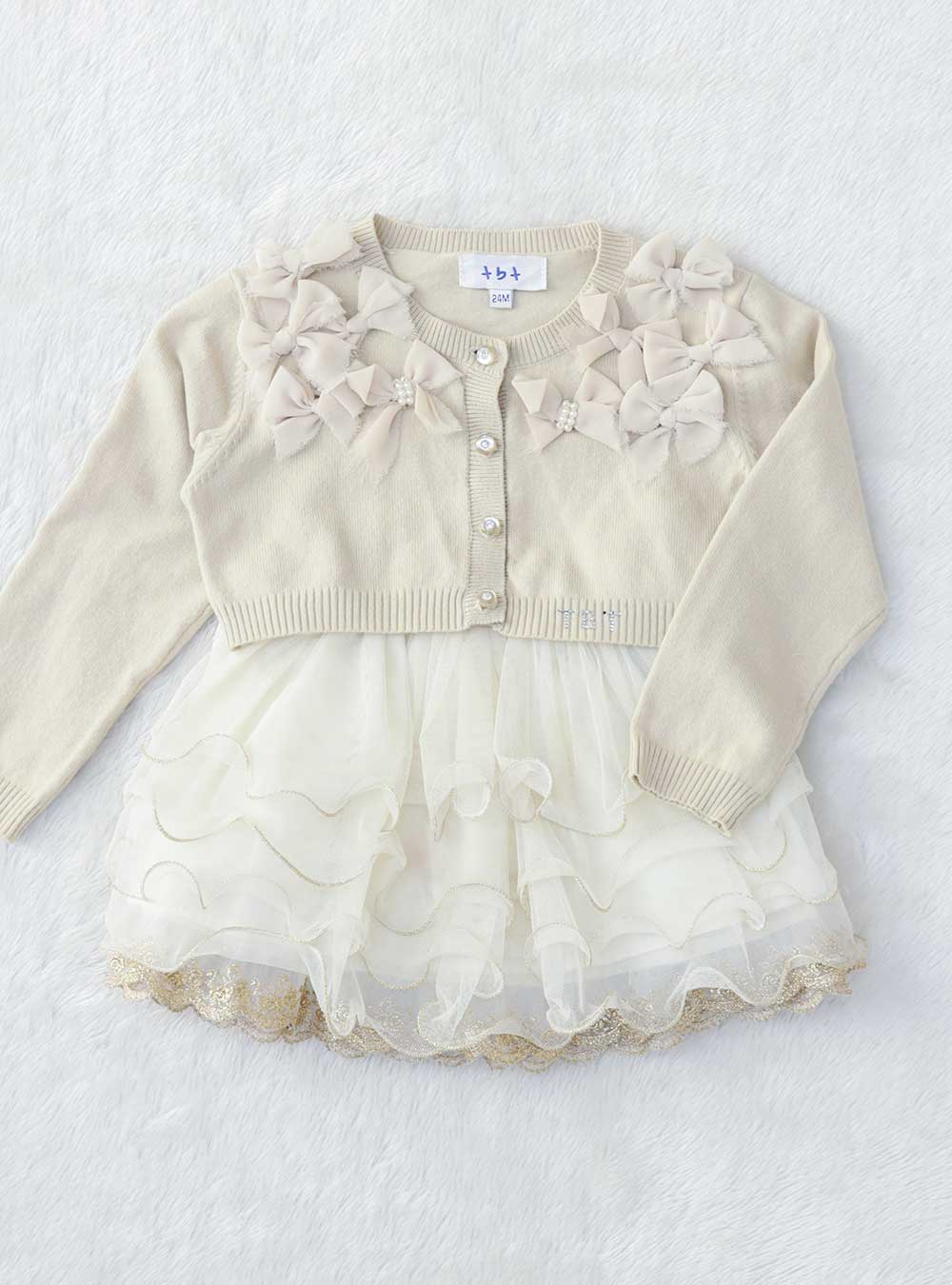 リボンの装飾がゴージャスなショート丈カーディガン。スカートはふんわりとしたティアードチュールスカートで裾にはゴールドラメが施されており、特別な日の装いに。 ウエスト部分はゴムタイプで着心地も良く幅広いサイズに対応します。カーディガンでカジュアルダウンし、ほどよいバランスにコーディネートされています。