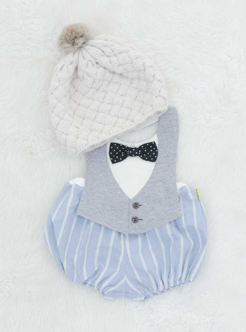 パンプキンパンツとグレーベストの組み合わせの衣装。グレーベストの胸元には黒の水玉模様の蝶ネクタイが付いており、シンプルながらもオシャレなデザインです。 パンツは爽やかなブルーのストライプ柄!ゆったりとしたシルエットのパンプキンパンツなので赤ちゃんらしい丸みのあるフォルムが、より可愛さを引き立たせます!