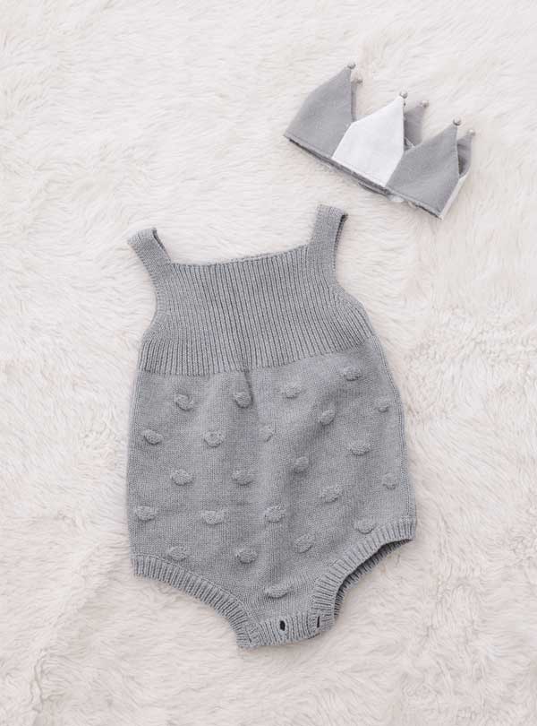 シンプルなグレーのニットロンパース。生地は柔らかいニット素材で作られていて、可愛らしい立体的なドット模様がワンポイントになったデザイン! 肩ひもは太めで首元も浅いカットになっているので、よく動く赤ちゃんでもズレにくい作りです。ブルマタイプなので赤ちゃん特有のむちっとした太ももが見えるのもオススメポイント!