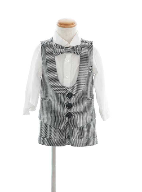 ホワイトの長袖シャツにグレーのギンガムチェック柄のベストとショートパンツが組み合わされたデザインのスーツ。丸く広く空いたベストは上品で可愛らしいデザインです。 さらに同じチェック柄の蝶ネクタイが付けられており、全体的に統一感があるとともに愛らしさを演出♪装飾のある背景をバックに自然な表情を残すスタイルがオススメ!