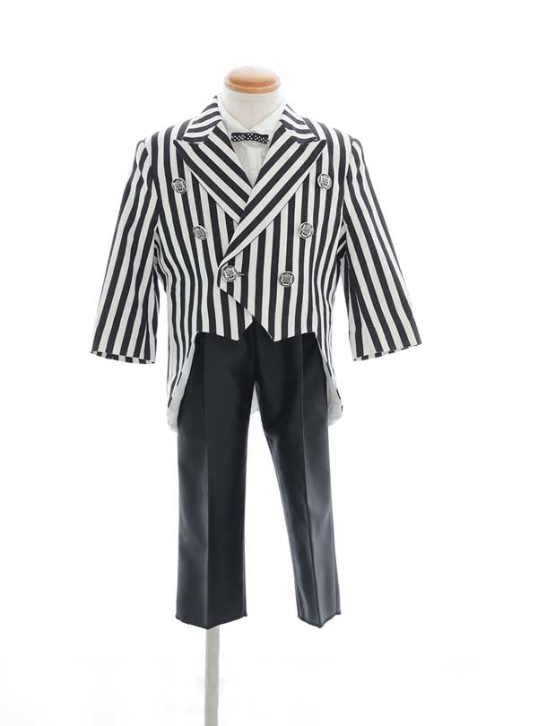 白黒のストライプ柄ジャケットが目を引く個性的でおしゃれなデザイン。燕尾服のシルエットがより1歳前後のお子様のフォルムをより可愛くみせてくれます。パンツ・シャツ・蝶ネクタイは全てモノトーンカラーで揃え、レトロ感のあるおしゃれな1着! 色鮮やかな小物と合わせて撮るとより写真映えするとともに、思い出の1枚になること間違いなし♪